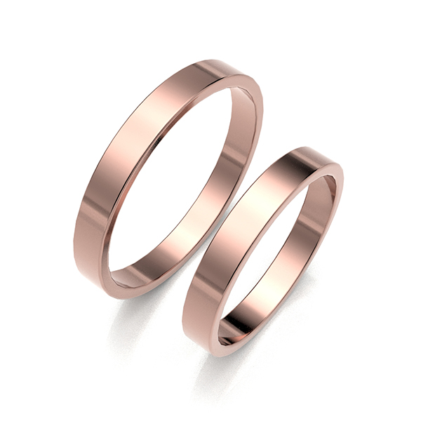 Klasyczne obrączki ślubne, wykonane z czerwonego złota próby 585, hartowane, wypolerowane na wysoki połysk. Profil płaski o szerokości 3 mm i wysokości 1,3 mm.