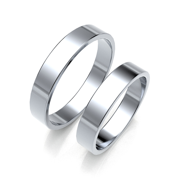 Klasyczne obrączki ślubne, wykonane z białego złota próby 585, hartowane, wypolerowane na wysoki połysk. Profil płaski o szerokości 4 mm i wysokości 1,3 mm.