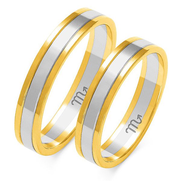Komplet obrączek ślubnych, wykonanych z białego i żółtego złota próby 585, hartowane, wypolerowane na wysoki połysk. Profil płaski o szerokości 4 mm i wysokości 1,3 mm. Białe złoto – szerokość 2 mm, żółte 1 mm.