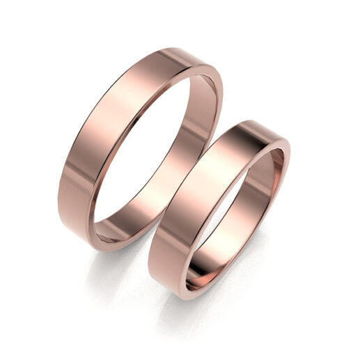 Klasyczne obrączki ślubne, wykonane z czerwonego złota próby 585, hartowane, wypolerowane na wysoki połysk. Profil płaski o szerokości 4 mm i wysokości 1,3 mm.