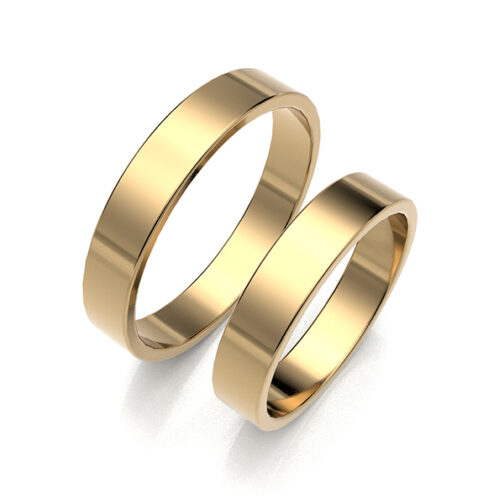 Klasyczne obrączki ślubne, wykonane ze złota próby 585, hartowane, wypolerowane na wysoki połysk. Profil płaski o szerokości 4 mm i wysokości 1,3 mm.
