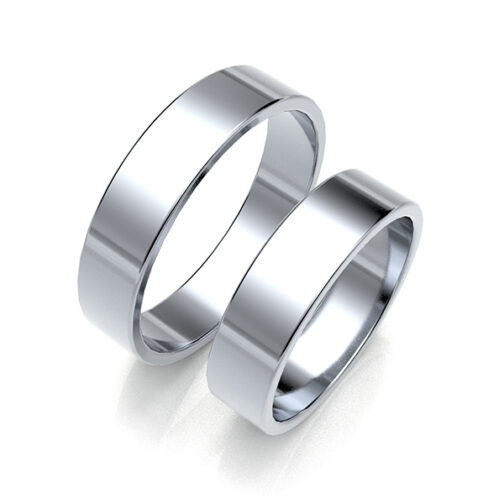 Klasyczne obrączki ślubne, wykonane z białego złota próby 585, hartowane, wypolerowane na wysoki połysk. Profil płaski o szerokości 5 mm i wysokości 1,3 mm.