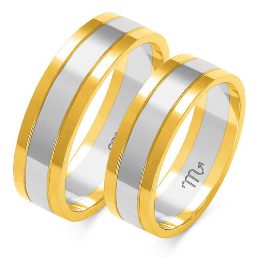Komplet obrączek ślubnych, wykonanych z białego i żółtego złota próby 585, hartowane, wypolerowane na wysoki połysk. Profil płaski o szerokości 6 mm i wysokości 1,3 mm. Białe złoto – szerokość 3 mm, żółte 1,50 mm.
