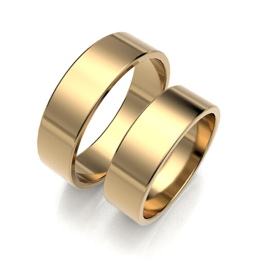 Klasyczne obrączki ślubne, wykonane ze złota próby 585, hartowane, wypolerowane na wysoki połysk. Profil płaski o szerokości 6 mm i wysokości 1,3 mm.