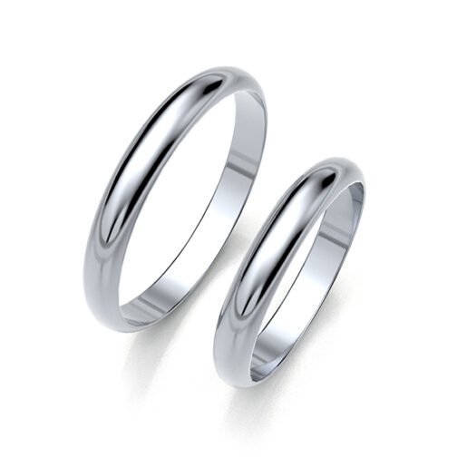 Klasyczne obrączki ślubne, wykonane z białego złota próby 585, hartowane, wypolerowane na wysoki połysk. Profil zaokrąglony o szerokości 3 mm i wysokości 1,3 mm.