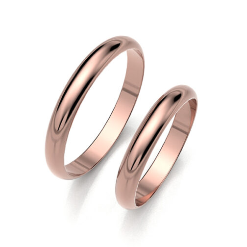 Klasyczne obrączki ślubne, wykonane z czerwonego złota próby 585, hartowane, wypolerowane na wysoki połysk. Profil zaokrąglony o szerokości 3 mm i wysokości 1,3 mm.