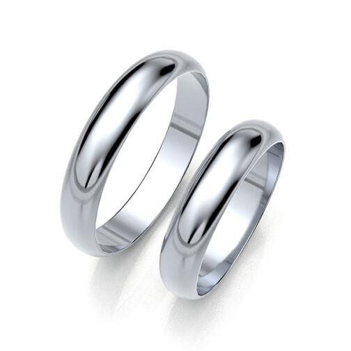 Klasyczne obrączki ślubne, wykonane z białego złota próby 585, hartowane, wypolerowane na wysoki połysk. Profil zaokrąglony o szerokości 4 mm i wysokości 1,3 mm.