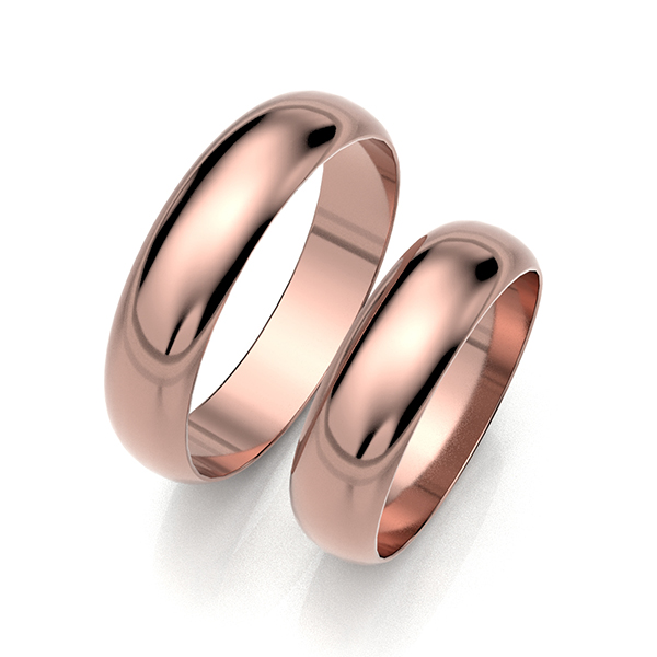 Klasyczne obrączki ślubne, wykonane z czerwonego złota próby 585, hartowane, wypolerowane na wysoki połysk. Profil zaokrąglony o szerokości 5 mm i wysokości 1,3 mm.