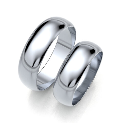 Klasyczne obrączki ślubne, wykonane z białego złota próby 585, hartowane, wypolerowane na wysoki połysk. Profil zaokrąglony o szerokości 6 mm i wysokości 1,3 mm.