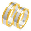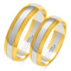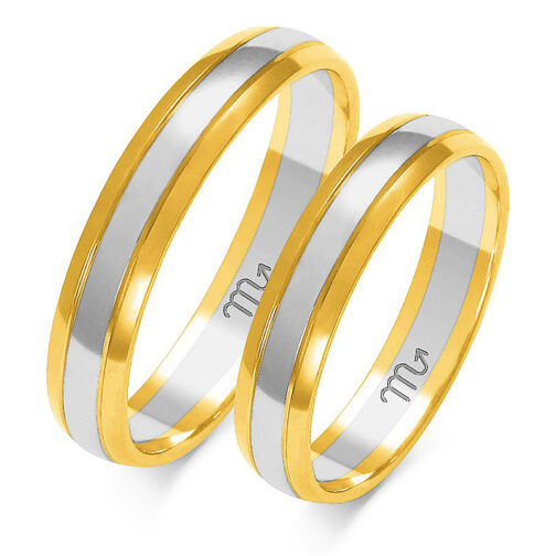Komplet obrączek ślubnych, wykonanych z białego i żółtego złota próby 585, hartowane, wypolerowane na wysoki połysk. Profil zaokrąglony o szerokości 4 mm i wysokości 1,3 mm. Białe złoto – szerokość 2 mm, żółte 1 mm.