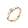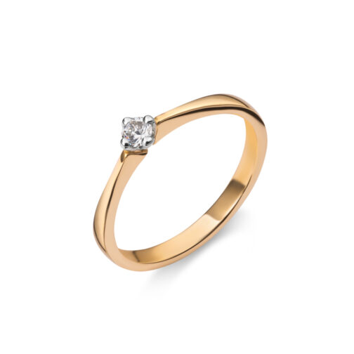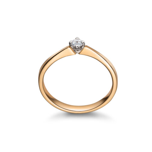 Pierścionek wykonany jest z 14-karatowego żółtego oraz białego złota (próba 585).
