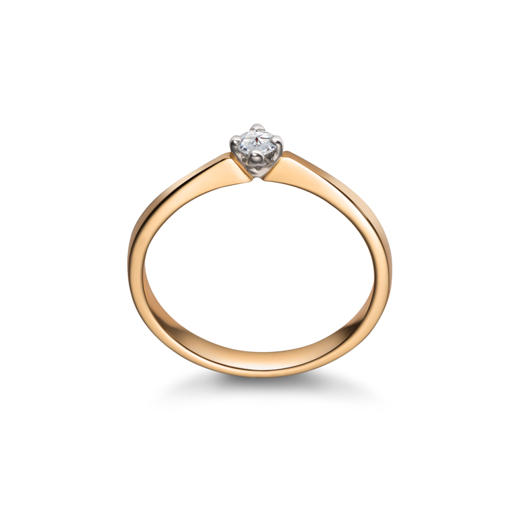 Pierścionek zaręczynowy z centralnie oprawionym diamentem o masie 0,07 ct, doskonałej czystości VVS2 i najwyższej barwie D oraz doskonałym szlifie brylantowym, średnica brylantu wynosi 2,79 mm.