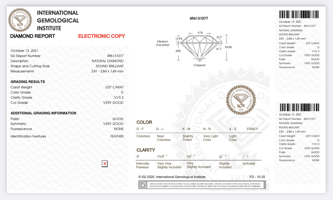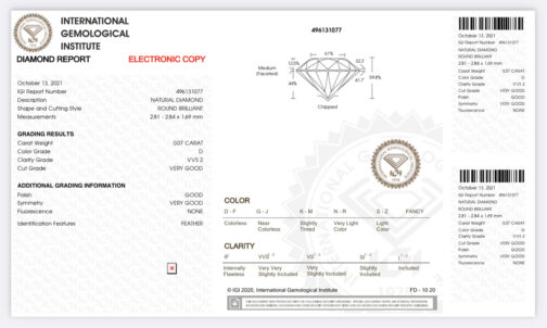Wszystkie diamenty w naszym sklepie objęte są wieczystą gwarancją oraz posiadają certyfikat jakości wystawiony przez czołowe niezależne laboratoria gemmologiczne GIA, IGI, HRD, dodatkowym elementem poświadczającym jakość wyrobu jest certyfikat wystawiony przez naszą pracownię jubilerską .