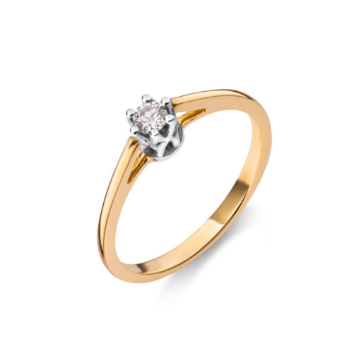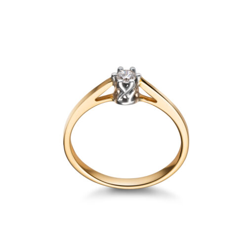 Pierścionek wykonany jest z 14-karatowego żółtego oraz białego złota (próba 585).