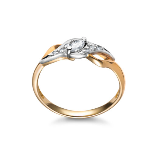 Pierścionek wykonany jest z 14-karatowego żółtego oraz białego złota (próba 585).