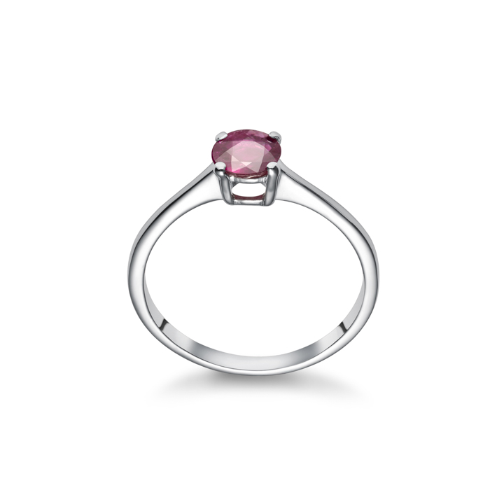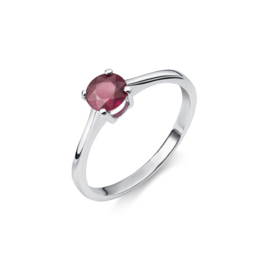 Pierścionek zaręczynowy z centralnie oprawionym rubinem o masie 0,50 ct, czystości Si, średnica rubinu wynosi 5,00 mm.